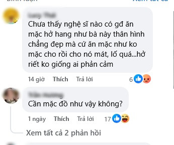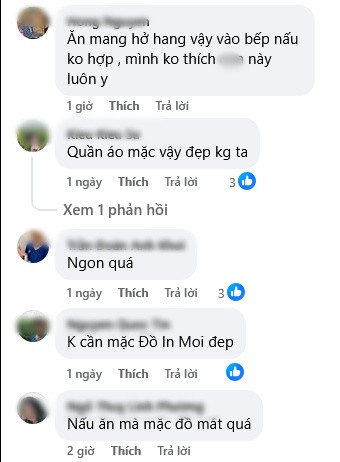 Dưới bài đăng, một số người để lại bình luận: “Nấu ăn mà mặc như đi biển vậy trời”, “Chưa thấy nghệ sĩ nào ăn mặc hở hang như bà này”, "Phản cảm", "Hở hang quá", "Mặc hở hang vậy vào bếp nấu không hợp"...
