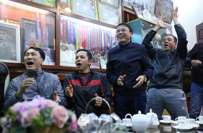 Ông Đoàn Minh Tiến (bên trái) hàng xóm của Quang Hải cũng có mặt xem trận đấu này chia sẻ: "Lúc Quang Hải bị chấn thương phải rời sân, tôi rất lo lắng cho kết quả quá trận đấu này cũng như tình trạng của cậu ấy. Tôi cứ lo lắng, trận này thiếu đi Quang Hải, U22 Việt Nam sẽ bị cầm hòa. Nhưng may sao chúng ta đã có bàn thắng vào những phút cuối trận".
