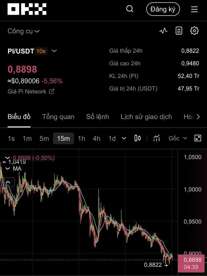 Tiền ảo Pi liên tục lao dốc. (Ảnh chụp màn hình)