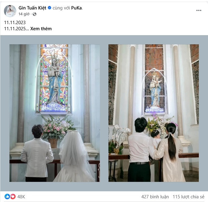 Mới đây, trên trang cá nhân, Gin Tuấn Kiệt chia sẻ hình ảnh mới gây chú ý. Theo đó, nam ca sĩ đăng tải ảnh cưới năm 2023 và tổ ấm có thêm một thành viên mới trong bức hình năm 2025.