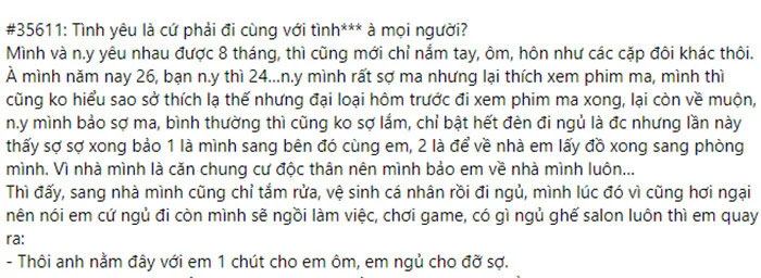 Vấn đề xuất hiện sau một buổi đi xem phim của cặp đôi. Chàng trai cho biết: "Người yêu mình rất sợ ma nhưng lại thích xem phim ma. Mình thì cũng không hiểu sao sở thích lạ thế nhưng đại loại hôm trước đi xem phim ma xong, lại còn về muộn, người yêu mình bảo sợ ma. Bình thường thì em cũng không sợ lắm, chỉ bật hết đèn đi ngủ là được nhưng lần này thấy sợ nên bảo một là mình sang bên đó cùng em, hai là về nhà em lấy đồ xong sang phòng mình. Vì nhà mình là ở chung cư một mình nên mình bảo em về nhà mình luôn…"