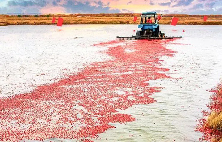 Họ sẽ dùng máy để tách quả ra khỏi cành, sau đó quây lại một khu rồi thu gom. Quả mạn việt quất vốn nhẹ hơn nước nên sẽ nổi lên trên mặt hồ, sau đó, người nông dân chỉ việc đẩy chúng theo dòng nước và gom lại.