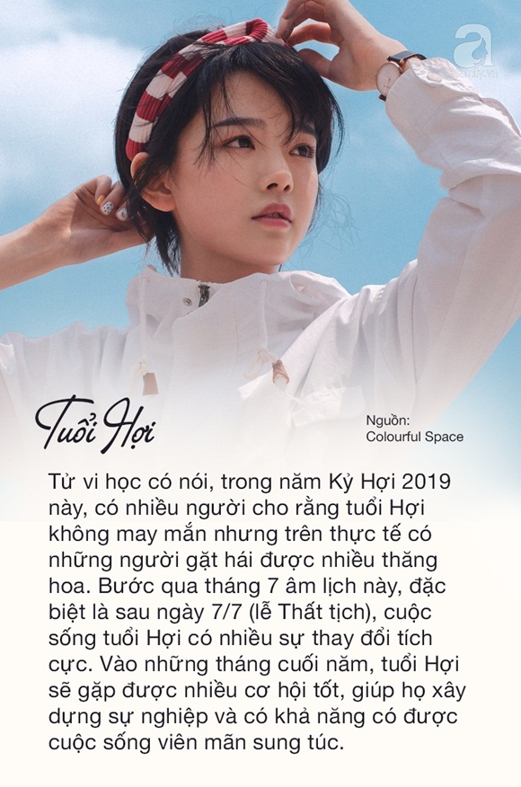 Tử vi học có nói, trong năm Kỷ Hợi 2019 này, có nhiều người cho rằng tuổi Hợi không may mắn nhưng trên thực tế có những người gặt hái được nhiều thăng hoa. Bước qua tháng 7 âm lịch này, đặc biệt là sau ngày 7/7 (Lễ Thất tịch), cuộc sống tuổi Hợi có nhiều sự thay đổi tích cực. Vào những tháng cuối năm, tuổi Hợi sẽ gặp được nhiều cơ hội tốt, giúp họ xây dựng sự nghiệp và có khả năng có được cuộc sống viên mãn sung túc. Nhìn chung, thời gian sắp tới sẽ là những ngày tháng đáng mong chờ với tuổi Hợi. Cùng chờ xem nhé!