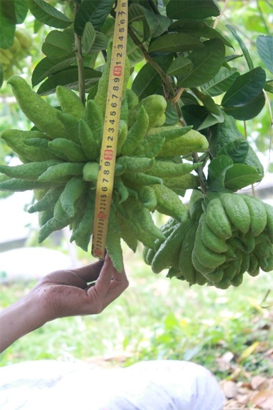 Tìm về vườn phật thủ của gia đình anh Tuân, chị Hoàn (Hoài Đức, Hà Nội), chúng tôi được chủ vườn dẫn đi xem quả phật thủ đặc biệt. Quả nằm thấp, sát gốc cây, có đường kính hơn 40 cm màu xanh đậm, các ngón tay dài, múp, được sắp xếp một cách hoàn hảo. Ở lớp ngoài cùng, các ngón to và dài nổi bật, bao trọn các lớp ngón bên trong.