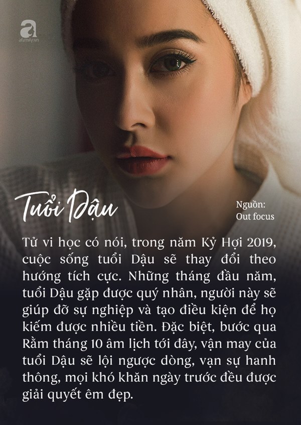 Tử vi học có nói, trong năm Kỷ Hợi 2019, cuộc sống tuổi Dậu sẽ thay đổi theo hướng tích cực. Những tháng đầu năm, tuổi Dậu gặp được quý nhân, người này sẽ giúp đỡ sự nghiệp và tạo điều kiện để họ kiếm được nhiều tiền. Đặc biệt, bước qua Rằm tháng 10 âm lịch tới đây, vận may của tuổi Dậu sẽ lội ngược dòng, vạn sự hanh thông, mọi khó khăn ngày trước đều được giải quyết êm đẹp. Trước khi bước qua năm 2020, tuổi Dậu sẽ tìm kiếm được hướng đi mới trong sự nghiệp, cuối năm nay nếu như không thành đại gia thì cũng dư dả tài vận, cuộc sống thoải mái.