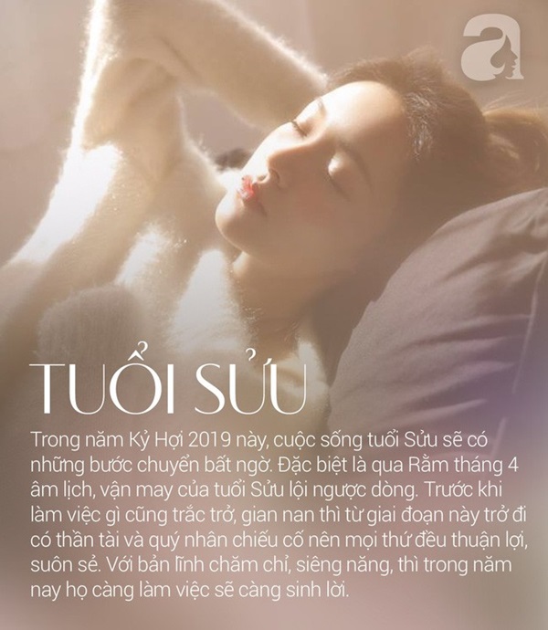 Trong năm Kỷ Hợi 2019 này, cuộc sống tuổi Sửu sẽ có những bước chuyển bất ngờ. Đặc biệt là qua Rằm tháng 4 âm lịch, vận may của tuổi Sửu lội ngược dòng. Trước khi làm việc gì cũng trắc trở, gian nan thì từ giai đoạn này trở đi có thần tài và quý nhân chiếu cố nên mọi thứ đều thuận lợi, suôn sẻ.
