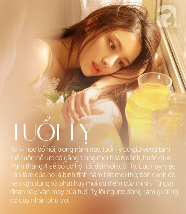Tuổi Tỵ là những người cầu tiến, luôn hướng về tương lai tươi đẹp, nhưng có lúc thần may mắn bỏ quên nên họ phải tự thân vận động. Tử vi học có nói, trong năm nay, tuổi Tỵ cứ giữ vững tâm thế, luôn nỗ lực cố gắng trong mọi hoàn cảnh, bước qua Rằm tháng 4 sẽ có cơ hội tốt đến với tuổi Tỵ.