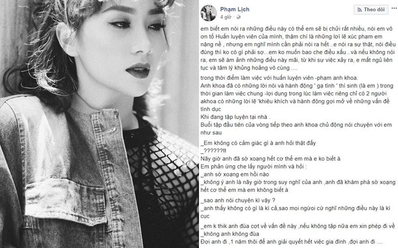 Trong thời điểm làm việc, huấn luyện viên Phạm Anh Khoa đã có những lời nói và hành động 'gạ tình' thí sinh là em. Trong thời gian làm việc chung - lợi dụng lúc làm việc riêng chỉ có 2 người anh Khoa có những lời lẽ khiêu khích và hành động gợi mở về những vấn đề tình dục", Phạm Lịch tiết lộ.