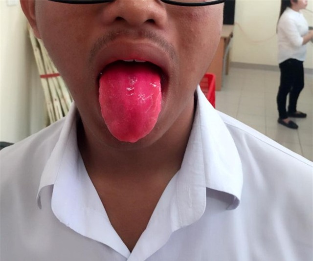 Lưỡi em học sinh vẫn đỏ lè sau khi đã súc miệng nước muối, đánh răng |