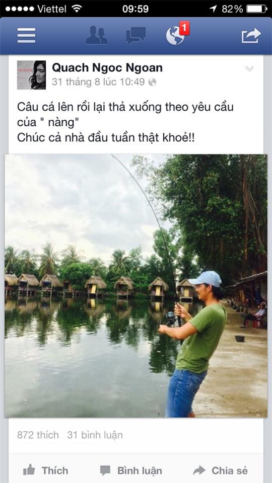 Thậm chí, vào hôm 29/8, Quách Ngọc Ngoan đưa lên trang cá nhân link bài viết: “Sao xịn đua nhau “lái máy bay bà già” với lời đề tựa: “Tình yêu là khi hai trái tim cùng chung nhịp đập, bất chấp tuổi tác”. Trước đó, Quách Ngọc Ngoan còn đưa lên trang cá nhân hình ảnh anh đang câu cá ở một khu sinh thái của ngoại thành Hà Nội với lời chú giải: “Câu cá lên rồi lại thả xuống theo yêu cầu của "nàng".