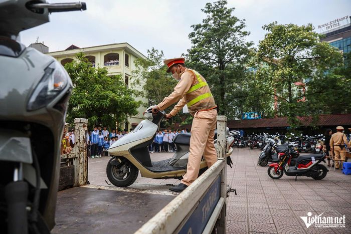 Cụ thể vào sáng 31/10, tổ công tác của Đội CSGT đường bộ số 6 (Phòng CSGT Công an TP Hà Nội) kiểm tra đột xuất bãi trông giữ xe bên trong trường THCS - THPT Hà Thành (quận Bắc Từ Liêm). Quá trình kiểm tra, tổ công tác phát hiện nhiều xe mô tô nhãn hiệu: Honda Vision, SH150... có phân khối từ 110cc - 150cc.
