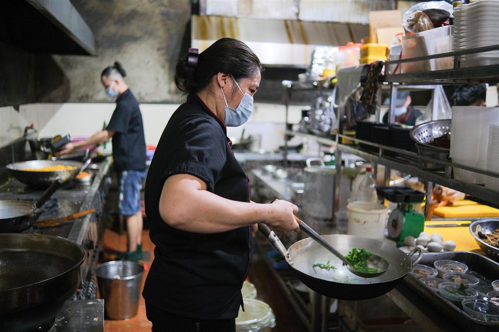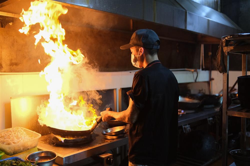 Nguyễn Thành Nam, nhân viên chuyên xào, thường xuyên phải tiếp xúc với bếp lửa. Đặc biệt, trong đợt Euro, lượng đơn tăng mạnh khiến công việc của anh cũng vất vả hơn. "Ngoài trời nóng lại còn gần bếp lửa nên mệt người lắm. Tuy nhiên, mình làm lâu rồi nên cũng quen", anh chia sẻ.