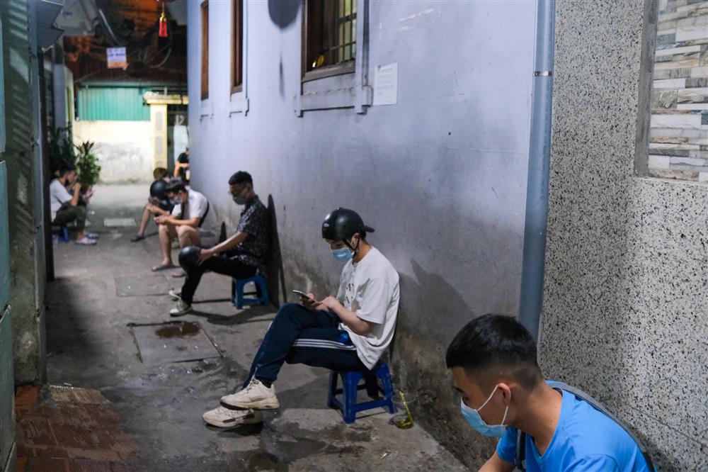 Các shipper ngồi hàng dài khi đồng hồ đã điểm gần 0h. Thời điểm này là lúc nhộn nhịp nhất do các trận đấu Euro 2020 diễn ra vào khung 23h và 2h. Trong thời điểm dịch bệnh còn diễn biến phức tạp, các shipper được yêu cầu giữ khoảng cách và đeo khẩu trang khi chờ đơn.