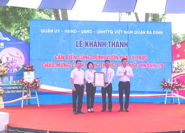 Chủ tịch UBND quận Ba Đình Tạ Nam Chiến trao Bằng công nhận công trình chào mừng kỷ niệm 78 năm Cách mạng Tháng Tám và Quốc khánh 2/9 cải tạo nâng cấp vườn hoa Lê Trực cho phường Điện Biên