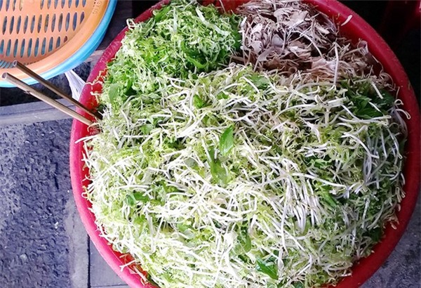 ăn kèm món bún gồm các loại rau quen thuộc như xà lách, giá đỗ, tía tô,
