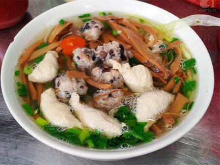 Như đã nói, bún ở đây có 2 món chính là mọc và gà, gà thì tuỳ chọn phần đùi, lườn, cánh hay thêm trứng non, tim, nhưng dù lựa chọn thế nào thì khi miếng thịt chạm vào đầu lưỡi, vẫn cảm nhận ngay được vị chắc ngọt của gà ta. Ngoài thứ gà ta chức thịt, ăn thơm, dai, ngọt đậm, linh hồn của tô bún Hàng Ngang chính là mọc. Hà Nội có biết bao quán bún mọc hoặc chí ít thì cũng có mọc mà lựa chọn, nhưng dám chắc chắng có chỗ nào làm được viên mọc giống ở đây.