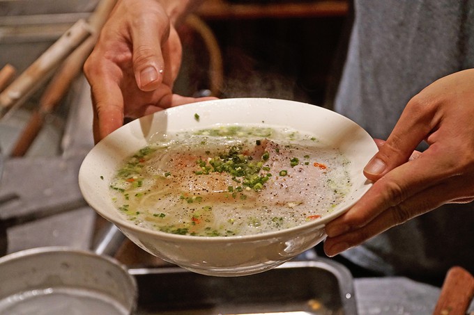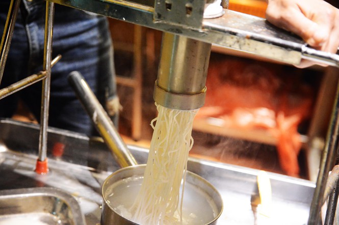 Ấy vậy mà ai cũng lấy là hứng khởi khi đứng xem quá trình chế biến món tại gian bếp mở. Thực khách tò mò vây quanh xem từng sợi bún tươi được làm tại chỗ. Quán ngâm bột gạo thật mềm, xay nhuyễn, vo thành khối và chỉ khi có khách gọi thì họ mới bắt đầu ép bún và trụng vào nước sôi để làm chín.