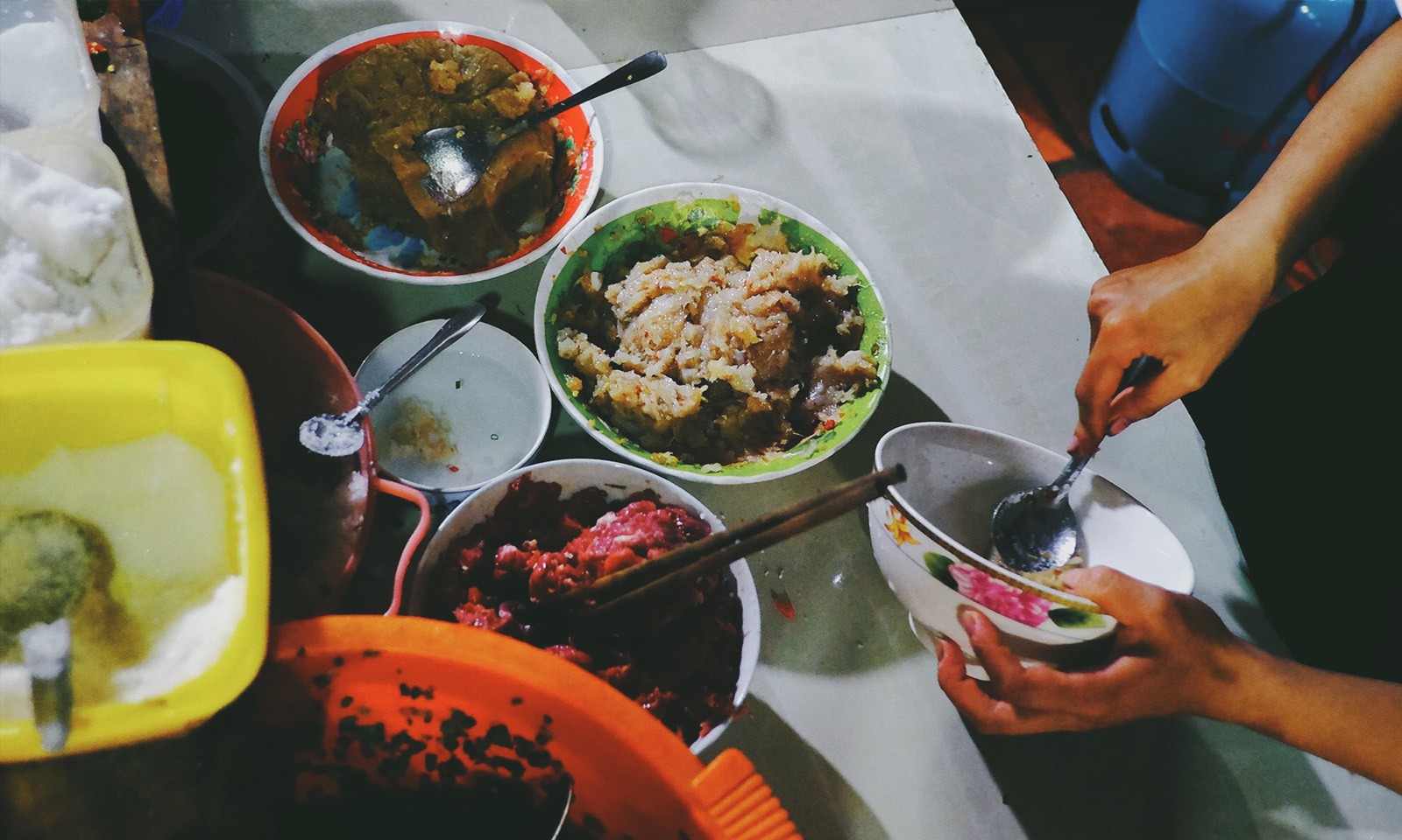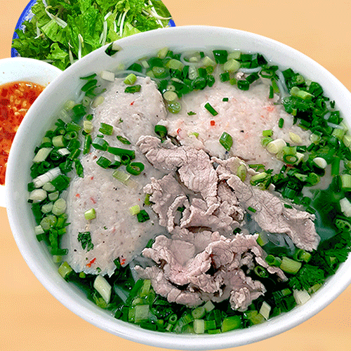 Khi đã có bún thì thức ăn kèm như chả cả, tôm, mực lần lượt được cho vào. Không phải được nấu chín từ trước, tất cả nguyên liệu sẽ giã nhuyễn, trộn đều với gia vị rồi quết lên thành tô. Chính phần nước luộc bún đang sôi lúc nãy sẽ được tận dụng làm súp, chan ngập để làm chín món. Hành lá, tiêu phủ đầy lên bề mặt để điểm tô thêm hương sắc cho tô bún thơm ngon, kích thích vị giác.