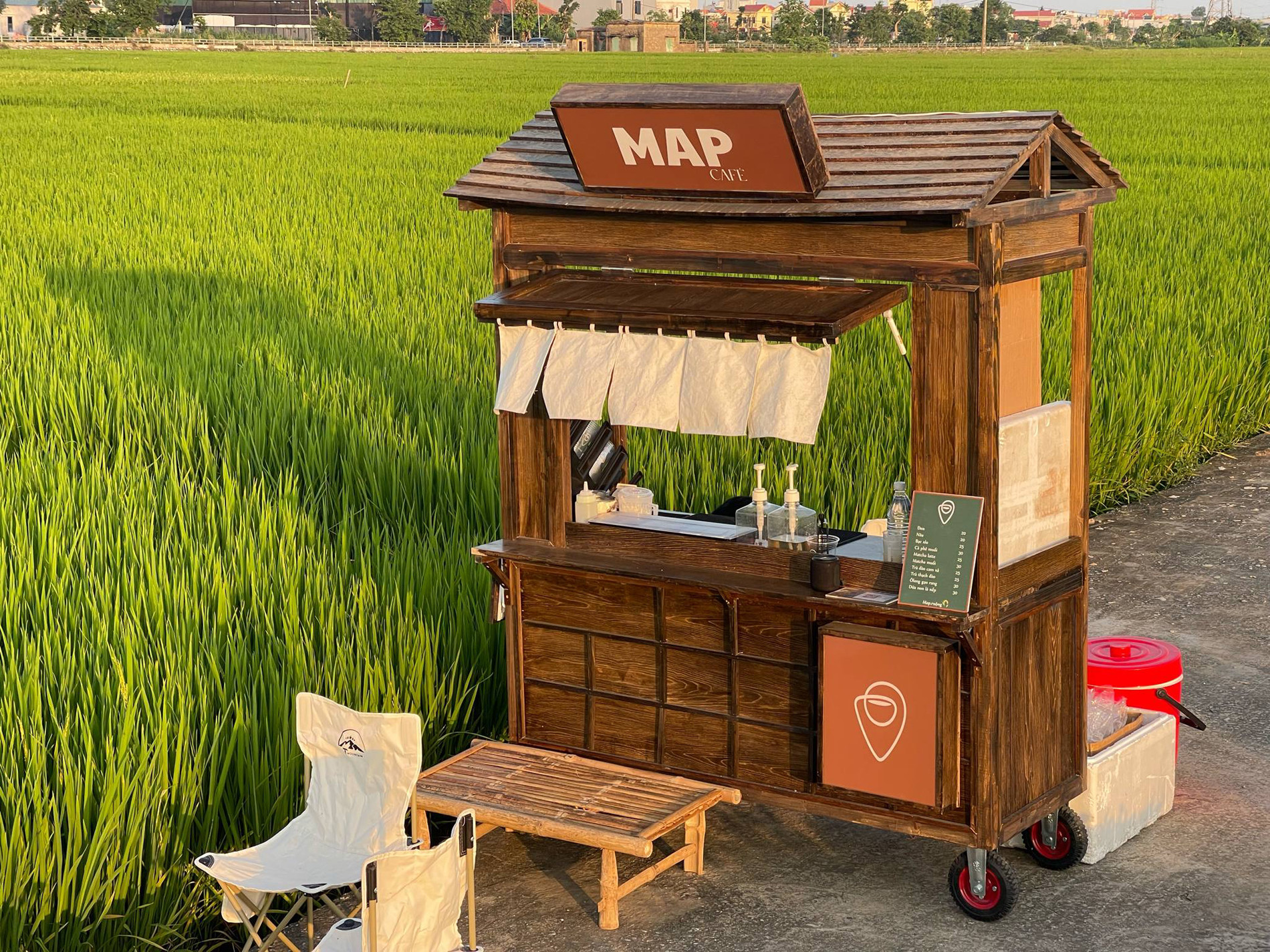 Theo đó, tiệm cà phê có thiết kế cơ động, nằm nép mình trên con đường nhỏ, xung quanh được bao bọc bởi những ruộng lúa đã trổ đòng.