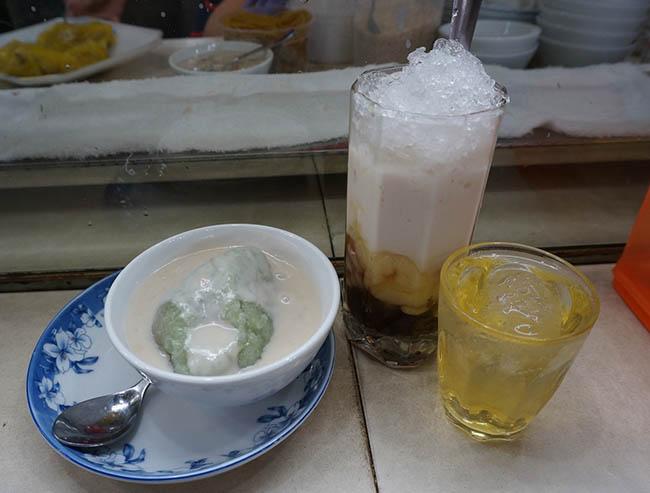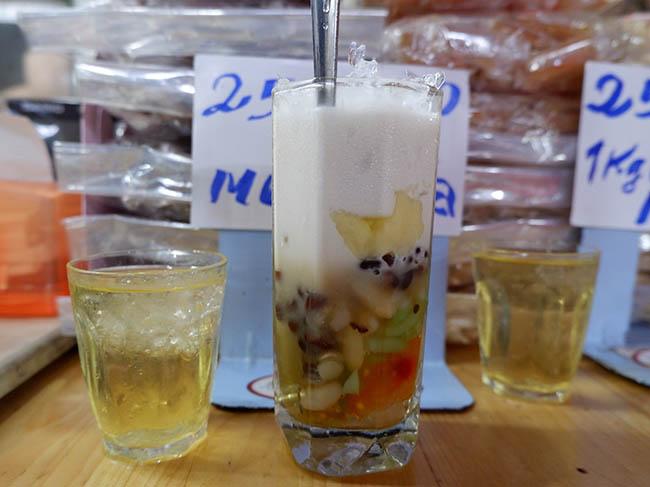 Một set "chè đủ thứ" gồm ly chè đá cốt dừa béo thơm và ly trà đá nhỏ, đúng chuẩn chè Sài Gòn bao lâu nay. Giá một ly chè thập cẩm là 27.000 đồng.