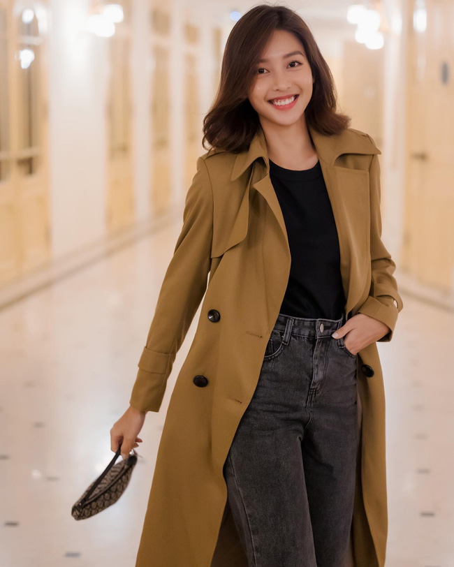 Áo trench coat rất hợp để diện trong mùa xuân không nóng cũng chẳng quá rét. Với kiểu áo khoác này, chị em chỉ cần layer bên trong combo áo thun đen và quần jeans đen như Khả Ngân là đã sành điệu miễn chê.