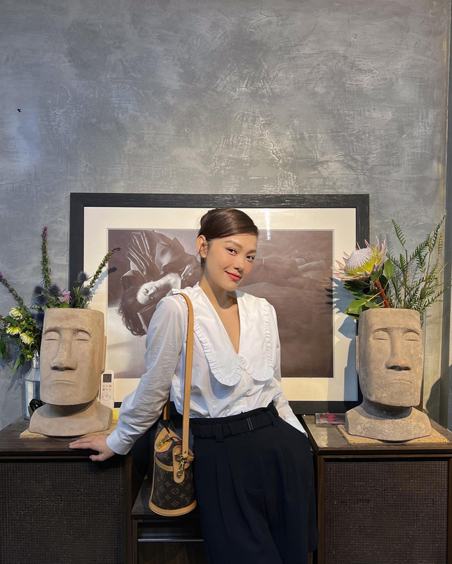 Minh Hằng thanh lịch và chuẩn công sở với combo áo blouse trắng + quần âu đen, sơ vin gọn gàng. Chi tiết cổ lá sen giúp tổng thể trang phục của Minh Hằng trông nữ tính, yêu kiều thêm.