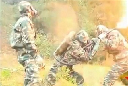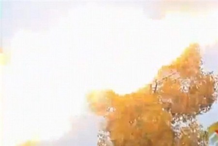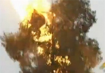 | Ngọn lửa thiêu chết lũ ong độc. Một binh sĩ tham gia diệt ong cho hay, họ trang bị quần áo, mặt nạ rất cẩn thận. Tổ ong khá lớn và khó lấy xuống. Họ nghĩ đến phương án hay nhất là dùng súng bắn lửa. Ảnh: Liveleak. |