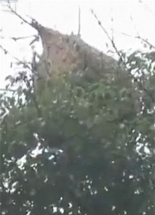 | Tổ ong đường kính 1,5 m treo lơ lửng trên cây, nằm cách gốc 30. Dân làng đã nhờ quân đội can thiệp vì loài ong kia từng đốt một người dân trong làng, gây tử vong. Ảnh: Liveleak. |