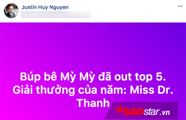 “Búp bê bị hư đã out Top 5. Giải thưởng của năm: Miss Dr.Thanh” - quản lý của người đẹp gốc Bắc Ninh viết.