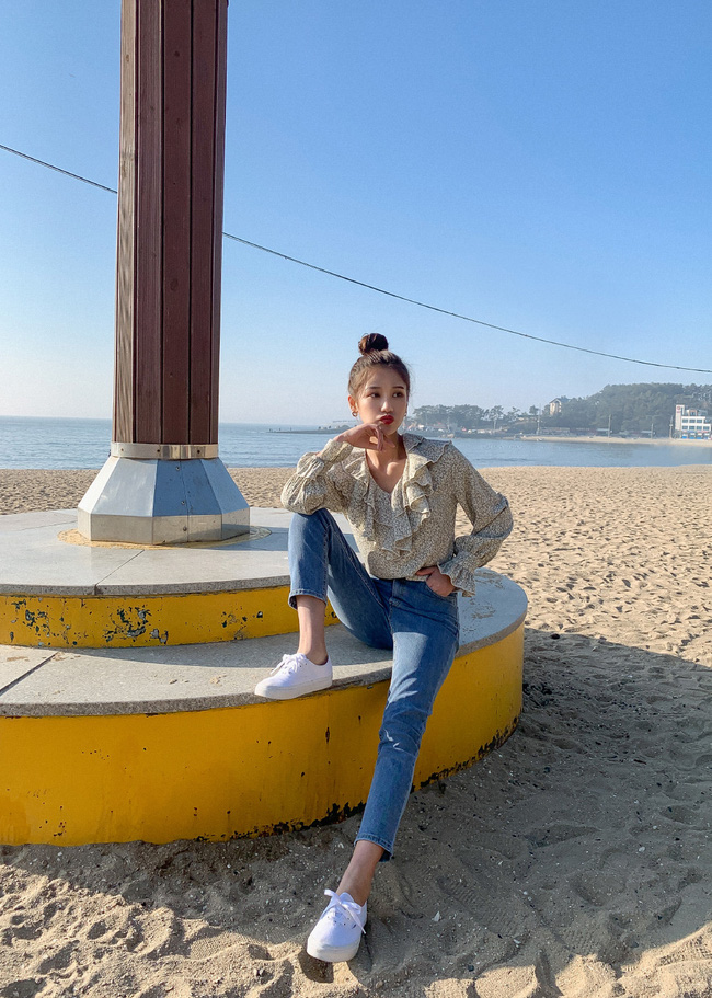 Áo blouse bèo nhún + quần skinny jeans sẽ giúp bạn nhân đôi vẻ nữ tính. Thế nhưng cái hay ở đây là nét trẻ trung, năng động vẫn được giữ trọn, nhất là khi bạn đi giày sneakers trắng.