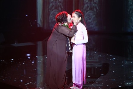 Hai cô trò Hiền Thục và Phương Mỹ Chi đã ôm chầm lấy nhau sau khi cùng hòa giọng ở liên khúc dài tới 3 bài. |
