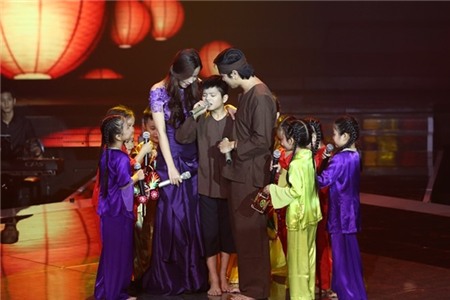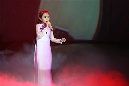 Cậu nhóc tiếp tục khoe giọng hát trong nhưng cao và đầy nội lực khi hát Quê nhà cùng hai HL. |