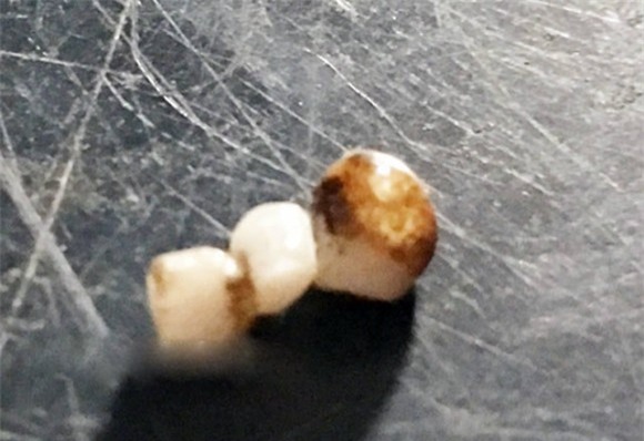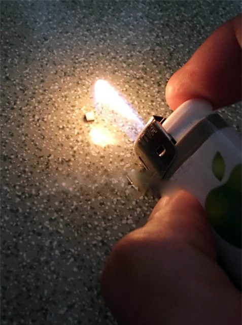 Khi chúng tôi sử dụng bật lửa đốt thử, số hạt gạo này cháy và tạo ra một chất lỏng láng mịn màu đục và sau đó chuyển sang màu nâu đen, chứ không hóa thành bột như hạt gạo bình thường.