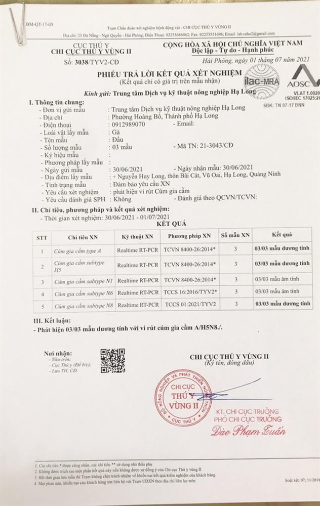 Kết quả xét nghiệm của Chi cục Thú y vùng II ghi nhận mẫu dương tính với virus cúm gia cầm A/H5N8