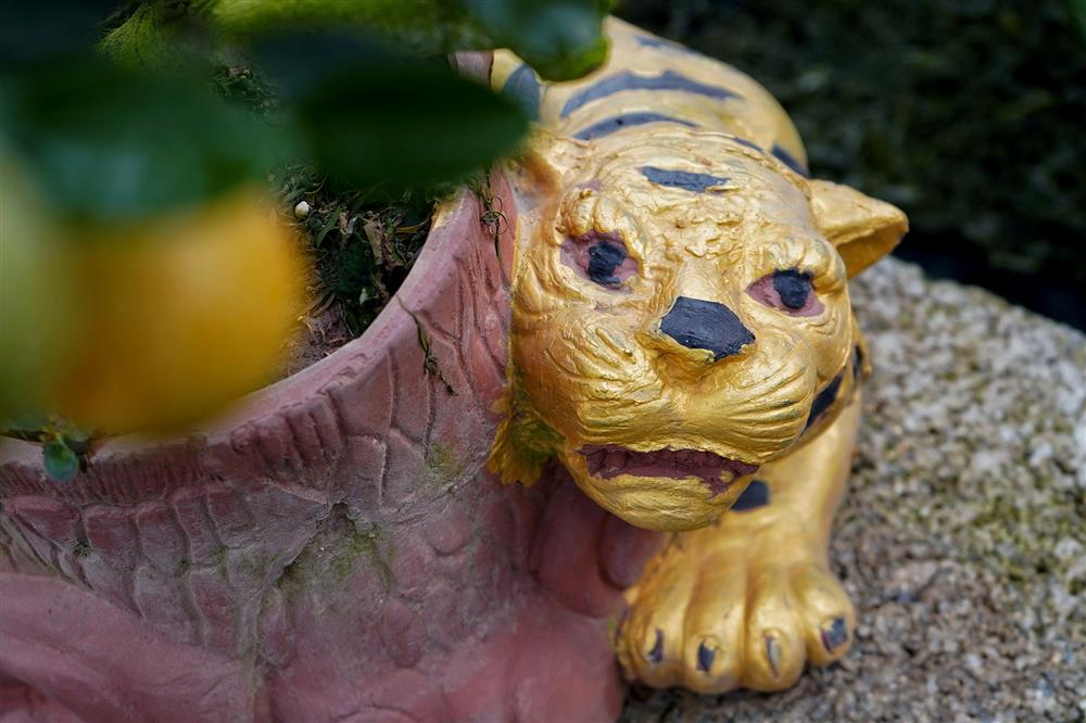 Những chú hổ vàng khoác lên lớp sơn vàng óng được tạc quanh chiếc bình gốm là sản phẩm của gia đình anh Nguyễn Huy Hoàng, vườn nhà anh là duy nhất trưng bày các sản phẩm Hổ vàng ôm quất độc đáo này.