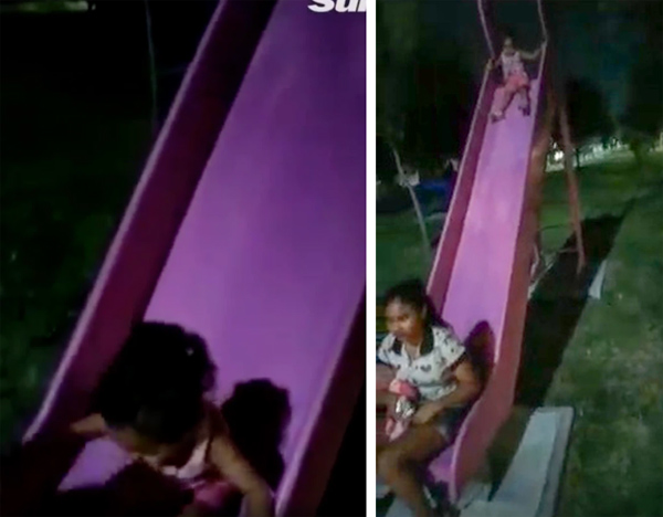 Trong đoạn video có thể thấy, 2 chị em gái đang chơi cầu trượt vui vẻ cùng nhau. Chị gái lớn xuống trước còn cô em nhỏ áo hồng theo sau. Mẹ của 2 cô bé chính là người quay video cho các con.