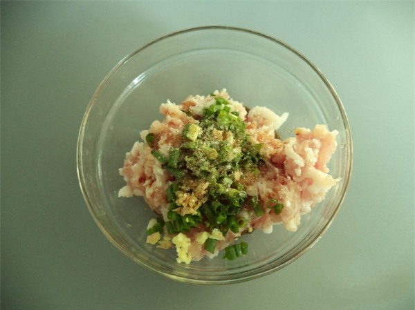 Cho thịt băm vào bát, thêm hành thái nhỏ, gừng tỏi băm nhỏ, đường, nước tương và hạt tiêu vào trộn đều.