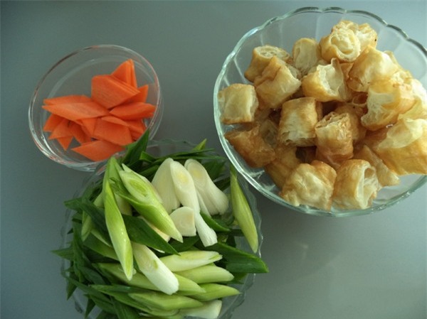 Cà rốt bào vỏ thái lát, quẩy cắt miếng nhỏ vừa ăn, tỏi tây rửa sạch thái khúc.