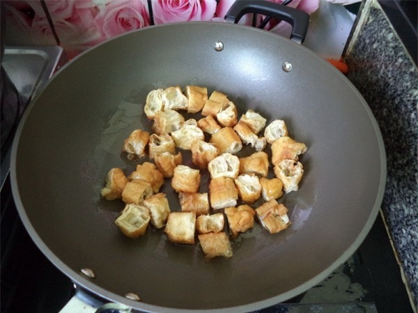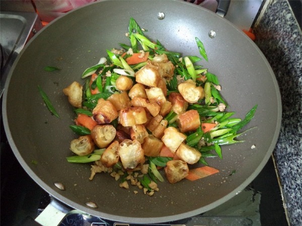 Cho một ít dầu ăn vào chảo, thêm quẩy vào đảo qua lại cho giòn rồi trút ra đĩa.