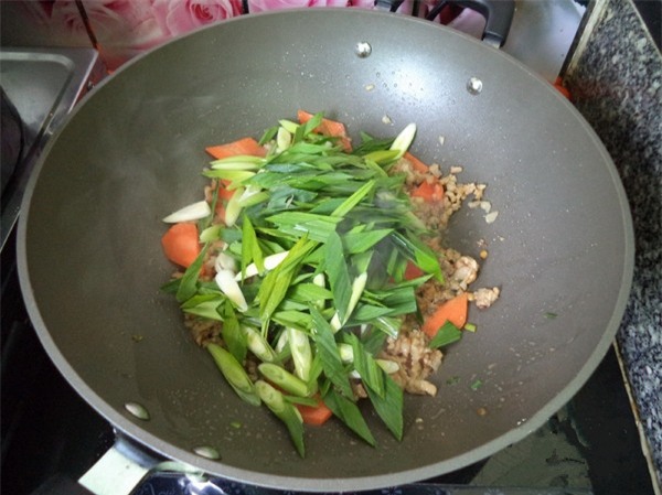 Vẫn dùng chảo đó, thêm thịt băm vào đảo tơi, tiếp đó cho cà rốt vào đảo chung. Khi cà rốt chín thì thêm tỏi tây vào.