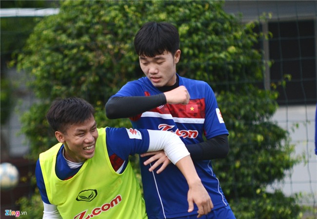 | Quế Ngọc Hải theo rất sát để kèm Xuân Trường. Hai người vốn rất thân mỗi khi lên tập trung đội tuyển. Cầu thủ của SLNA liên tục theo để chọc người đàn em. |