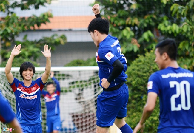 | Xuân Trường liên tục ghi dấu ấn trên sân tập tại Trung tâm thể thao Công an TP.HCM. Anh ghi một bàn bằng một cú ném bóng hiểm hóc. Tiền vệ này rất phấn khích với pha lập công... bằng tay này. |