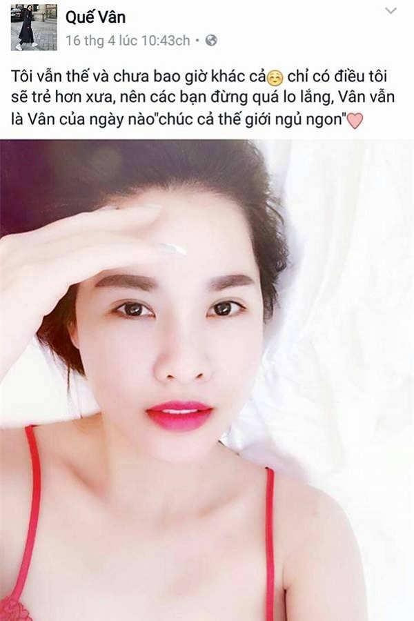Sau nhiều ngày lảng tránh nghi án trùng tu nhan sắc, mới đây Quế Vân đã chính thức lên tiếng về gương mặt đang gây xôn xao dư luận. Cô khẳng định mình vẫn giống như ngày xưa và khuyên người hâm mộ đừng nên quá lo lắng.