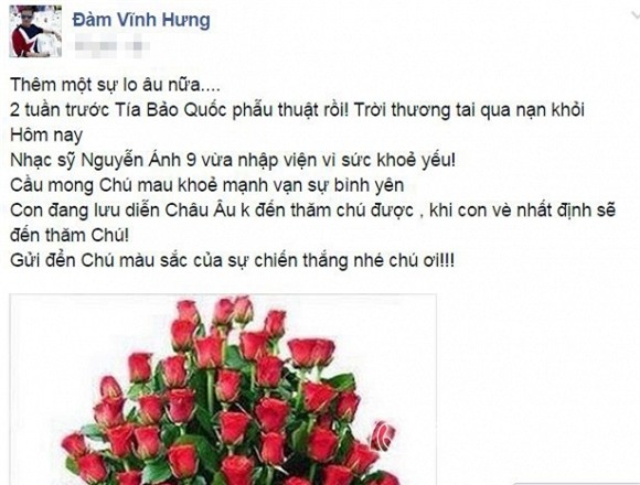 Mới đây, khi tình hình sức khỏe của nhạc sĩ Nguyễn Ánh 9 ngày càng suy yếu, Đàm Vĩnh Hưng đã gửi lời chúc: "Thêm một sự lo âu nữa... Hai tuần trước tía Bảo Quốc phẫu thuật rồi! Trời thương tai qua nạn khỏi. Hôm nay nhạc sĩ Nguyễn Ánh 9 vừa nhập viện vì sức khoẻ yếu! Cầu mong chú mau khoẻ mạnh vạn sự bình yên. Con đang lưu diễn châu Âu không đến thăm chú được. Khi con về nhất định sẽ đến thăm chú. Gửi đến chú màu sắc của sự chiến thắng nhé chú ơi!".