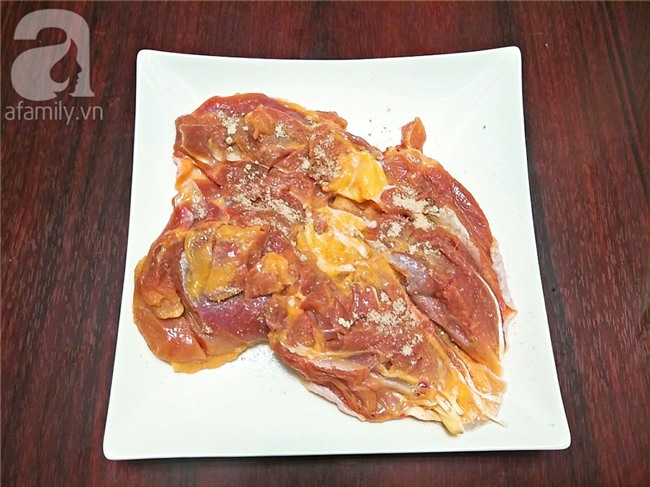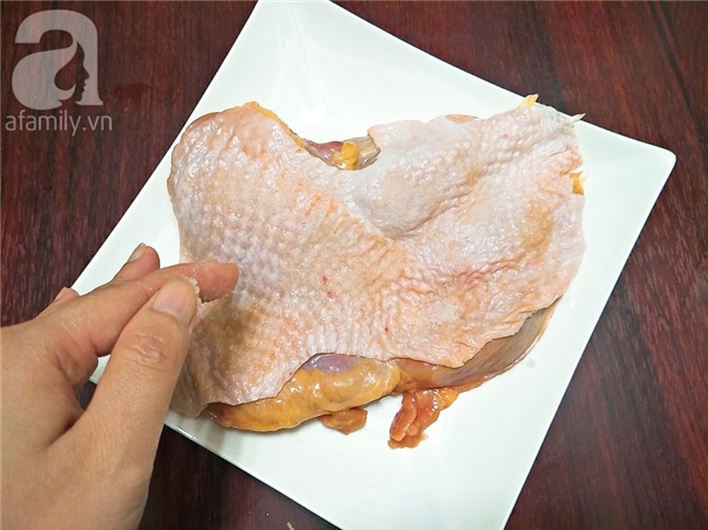 Bạn cho phần da xuống dưới và rắc chút bột nêm, tiêu, rượu trắng xoa đều cho thịt ngấm gia vị, ướp thịt ít nhất 30 phút.