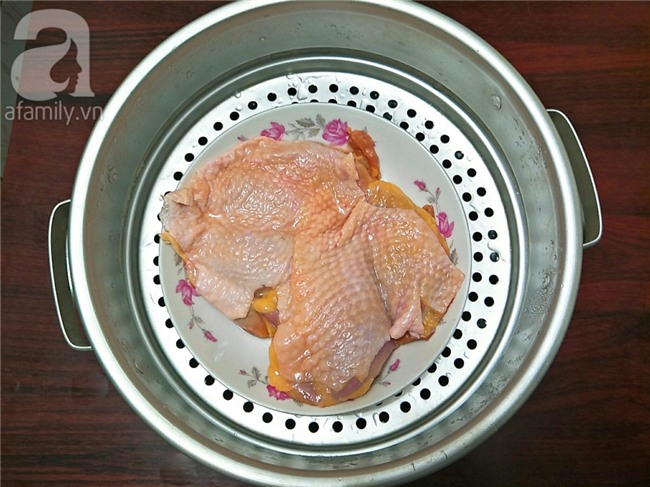 Thịt gà sau khi đã ngấm gia vị, bạn cho vào 1 cái đĩa sâu lòng sau đó đem thịt mang đi hấp chín.