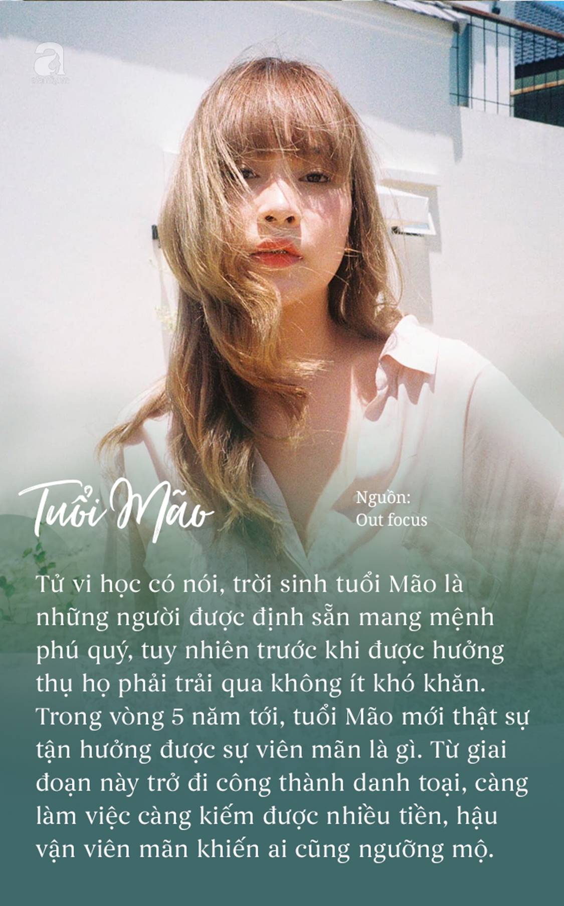 Từ bé tuổi Mão gặp không ít khó khăn, dù được sinh ra trong gia đình hạnh phúc nhưng lại thiếu thốn về vật chất. Khi lớn lên, tuổi Mão vốn thông minh chăm chỉ đã không ngừng cố gắng, nỗ lực để thay đổi cuộc sống của mình, tự mình thay đổi bản thân để tìm được những điều tốt đẹp nhất. Tử vi học có nói, trời sinh tuổi Mão là những người được định sẵn mang mệnh phú quý, tuy nhiên trước khi được hưởng thụ họ phải trải qua không ít khó khăn. Trong vòng 5 năm tới, tuổi Mão mới thật sự tận hưởng được sự viên mãn là gì. Từ giai đoạn này trở đi công thành danh toại, càng làm việc càng kiếm được nhiều tiền, hậu vận viên mãn khiến ai cũng ngưỡng mộ.