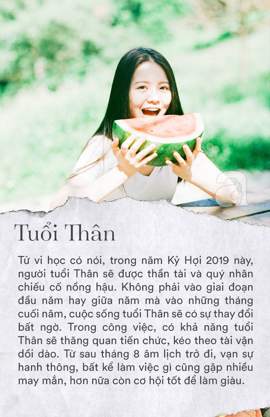 Tử vi học có nói, trong năm Kỷ Hợi 2019 này, người tuổi Thân sẽ được thần tài và quý nhân chiếu cố nồng hậu. Không phải vào giai đoạn đầu năm hay giữa năm mà vào những tháng cuối năm, cuộc sống tuổi Thân sẽ có sự thay đổi bất ngờ. Trong công việc, có khả năng tuổi Thân sẽ thăng quan tiến chức, kéo theo tài vận dồi dào. Từ sau tháng 8 âm lịch trở đi, vạn sự hanh thông, bất kể làm việc gì cũng gặp nhiều may mắn, hơn nữa còn cơ hội tốt để làm giàu. Dự kiến, cuối năm 2019, tuổi Thân giàu có thôi chưa đủ mà đời sống tình cảm cũng thăng hoa bất ngờ, những ngày tháng sau này chỉ việc tận hưởng cuộc sống an nhàn.