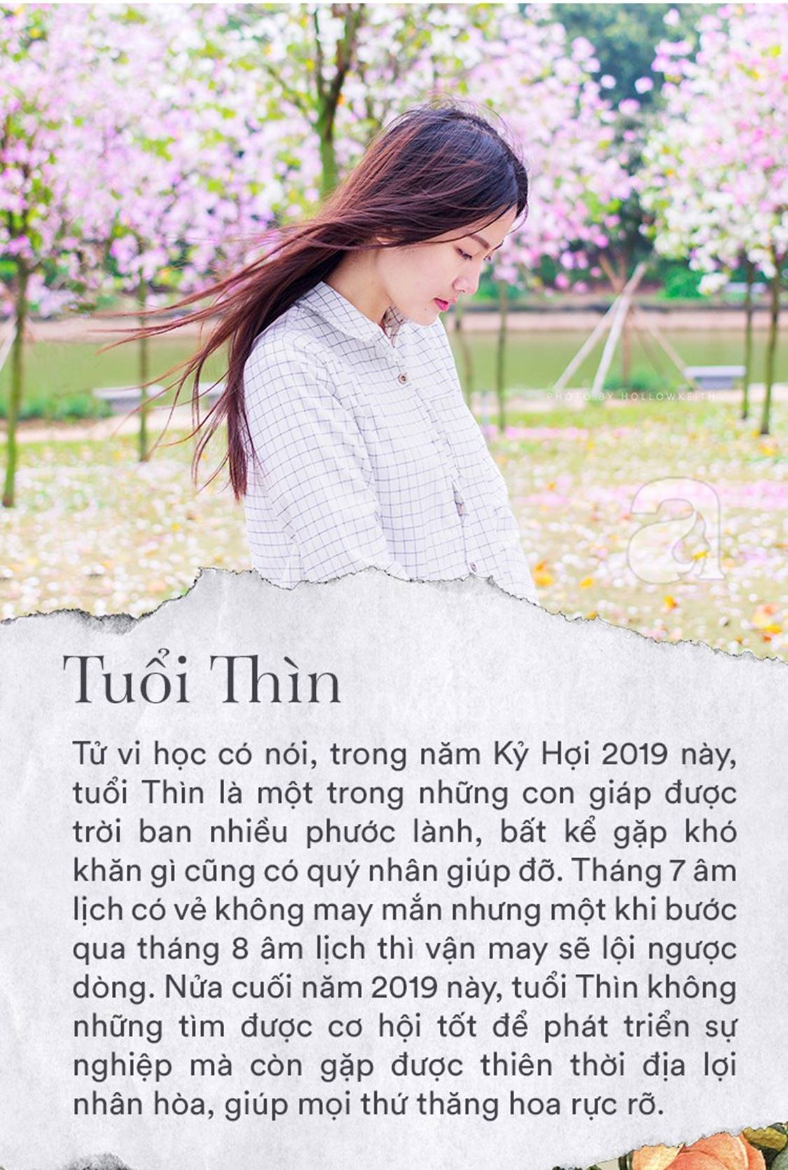 Tử vi học có nói, trong năm Kỷ Hợi 2019 này, tuổi Thìn là một trong những con giáp được trời ban nhiều phước lành, bất kể gặp khó khăn gì cũng có quý nhân giúp đỡ. Tháng 7 âm lịch có vẻ không may mắn nhưng một khi bước qua tháng 8 âm lịch thì vận may sẽ lội ngược dòng. Nửa cuối năm 2019 này, tuổi Thìn không những tìm được cơ hội tốt để phát triển sự nghiệp mà còn gặp được thiên thời địa lợi nhân hòa, giúp mọi thứ thăng hoa rực rỡ. Dự kiến, cuối năm nay đầu năm sau, tuổi Thìn sẽ có được cuộc sống viên mãn sung túc mà mình hằng mơ ước, muốn gì có đó, ngày tháng sau này chỉ việc an nhàn hưởng thụ.