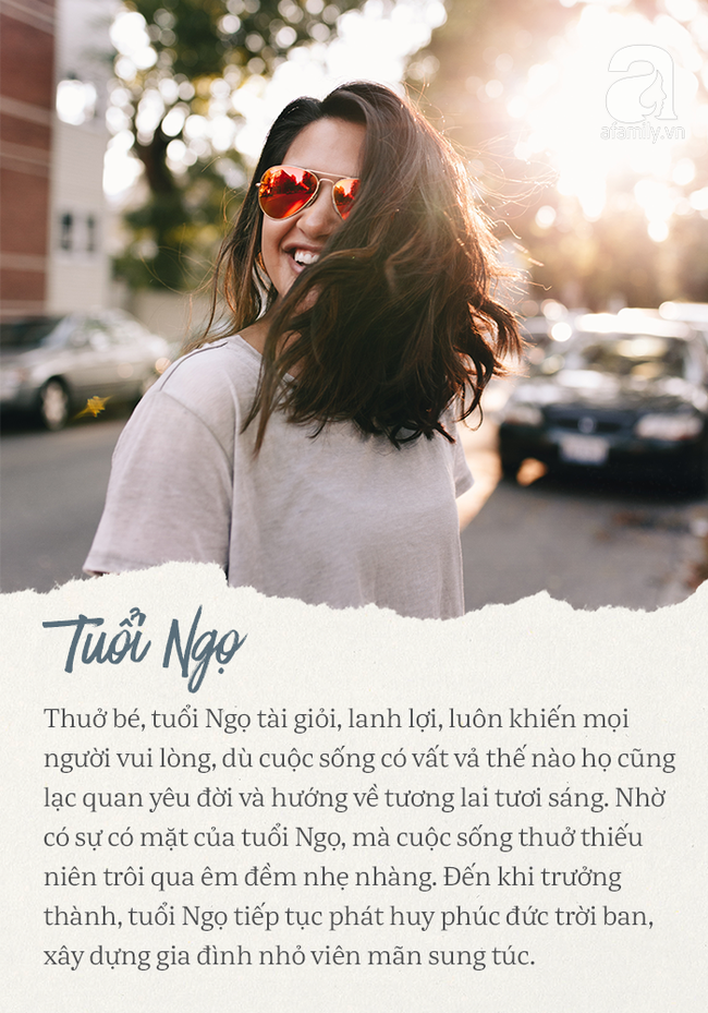 Trời sinh tuổi Ngọ là những người thoải mái, thích tự do, ung dung tự tại, không muốn bị ràng buộc. Tử vi học có nói, tuổi Ngọ là con giáp sở hữu được nhiều vận may của thượng đế, dù không ở gần gia đình nhưng họ luôn mang đến nhiều phúc đức cho bố mẹ và người thân xung quanh. Thuở bé, tuổi Ngọ tài giỏi, lanh lợi, luôn khiến mọi người vui lòng, dù cuộc sống có vất vả thế nào họ cũng lạc quan yêu đời và hướng về tương lai tươi sáng. Nhờ có sự có mặt của tuổi Ngọ, mà cuộc sống thuở thiếu niên trôi qua êm đềm nhẹ nhàng, không nước mắt. Đến khi trưởng thành, tuổi Ngọ tiếp tục phát huy phúc đức trời ban, xây dựng gia đình nhỏ viên mãn sung túc . Hậu vận, tuổi Ngọ chẳng cần lo lắng cơm áo gạo tiền, từ 40 tuổi trở đi, phúc tài tự đến trước nhà, việc cần làm là đón nhận và an nhàn hưởng phước.